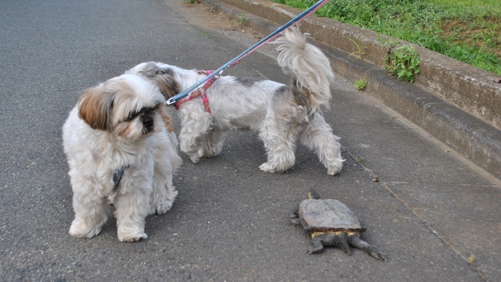 ワンちゃんたちに交ざって、カメさんが一緒に散歩していました。