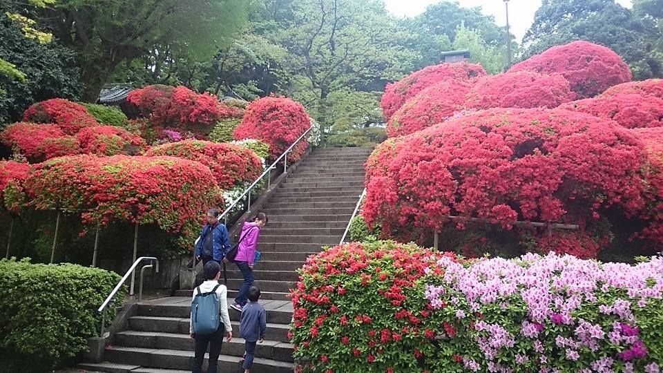 ※4月25日現在「赤色のキリシマツツジがメインの正面階段脇は、見頃が続いています。正面と女坂周辺が同時に見頃になるのは初めての事です。女坂周辺は散り始める花が目立ち始めました。 」